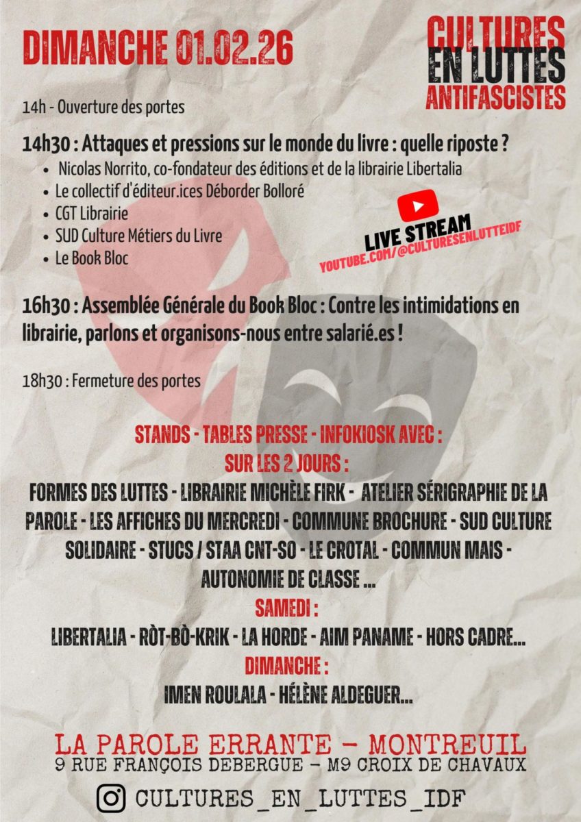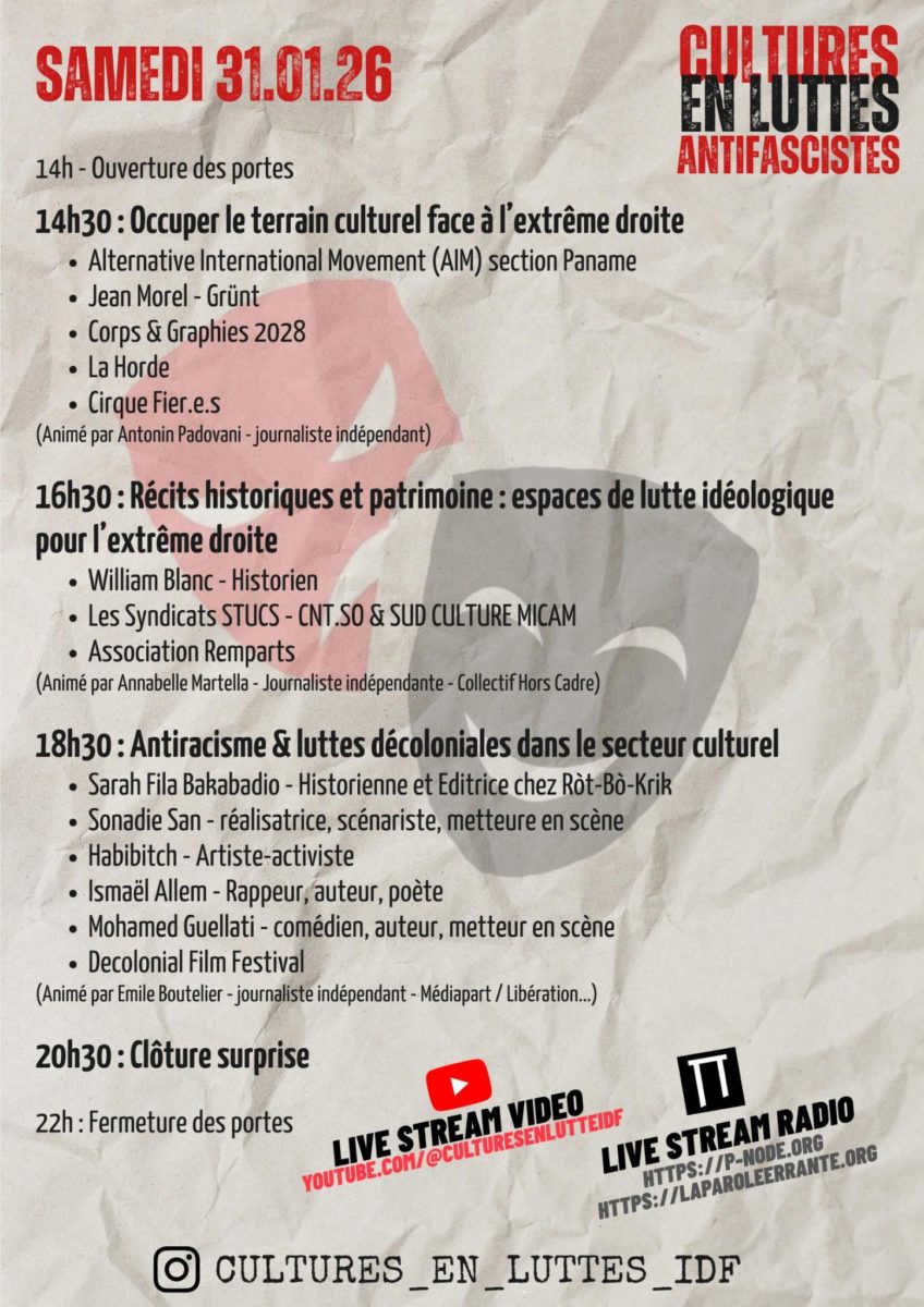 Cette discussion faisait suite au premier jour du week-end de tables rondes organisé par Cultures en lutte à La Parole Errante, sur le thème de la monté de la présence et du pouvoir de l’extrême droite dans divers secteurs de la culture en France.